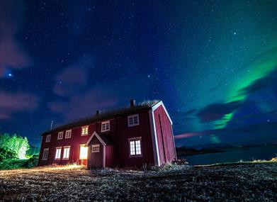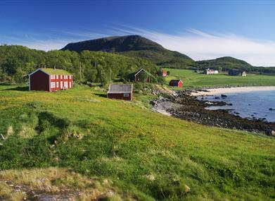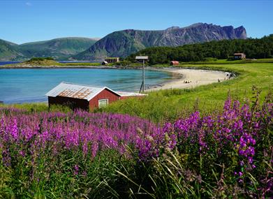 Elgsnes located in a scenic area with mountains and fjords, green meadows and a rich bird and dyreliv.I Andfjorden next Elgnes multitudes of good fishing spots for halibut, cod, pollock, haddock, ling, tusk, redfish and most other species that exist here in the north. In the sea there are also seals, porpoises and small whales and eagles soar over with a keen eye for fish that come up to ovrflaten. On fine summer one can enjoy the beach life on the sandy shoreline in the horseshoe-shaped bay harbor, and on quiet summer evenings fargeprakten when the midnight sun reflecting off the ocean. Taking the trip up the mountain elk above the farm, one has a fantastic view in all directions. Elgsnes is very open and with little light pollution is also excellent for the hunting orca products aurora observations in the dark season.
