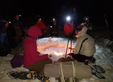 Our snowshoe hikes are guided by English speaking guides who takes you through a wandering with storytelling in the night. The hike goes up the valley right outside our doorstep. At the end of the route a bonfire is lit, hot drinks and a light meal is served.